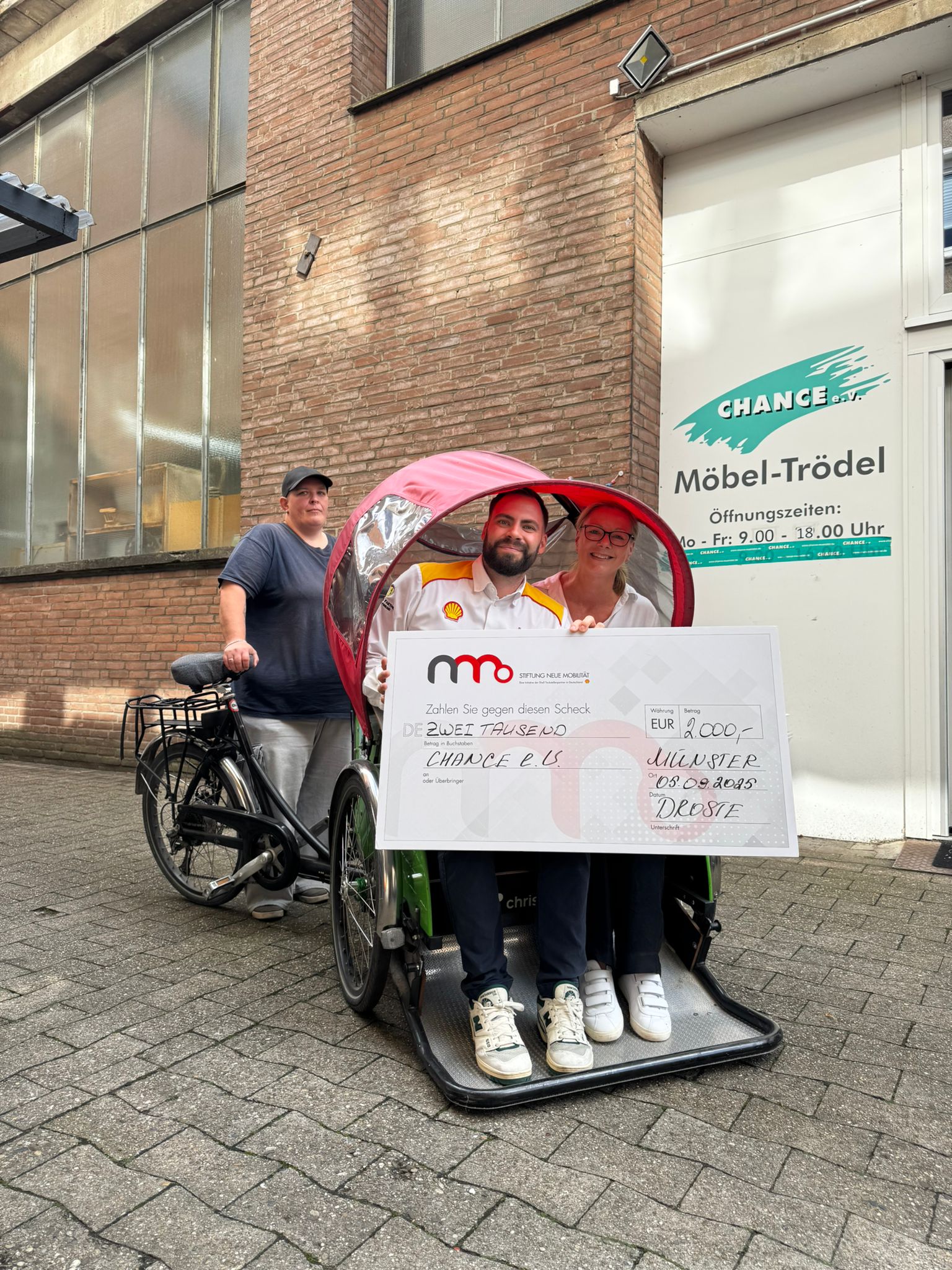 Seit seiner Gründung im Jahr 2013 in Kopenhagen hat sich das Projekt „Radeln ohne Alter“ zu einer internationalen Bewegung entwickelt. Auch der Verein CHANCE e.V. Münster ist Teil dieses Netzwerks und engagiert sich mit großem Einsatz für die soziale Teilhabe älterer Menschen. CHANCE e.V. bietet kostenfreie Rikscha Fahrten für Bewohnerinnen und Bewohner von Senioreneinrichtungen in Münster an. Geschulte Pilotinnen und Piloten holen die Fahrgäste direkt in ihrem Alltag ab – oftmals geprägt von Einsamkeit und eingeschränkter Mobilität – und schenken ihnen auf diese Weise wertvolle Momente der Aufmerksamkeit, Begegnung und Lebensfreude. Das Projekt in Münster verfolgt dabei einen inklusiven und sozial-integrativen Ansatz: Menschen mit randständigem Hintergrund, darunter ehemals Wohnungslose, Langzeitarbeitslose oder Personen mit psychischen Erkrankungen, werden gezielt als Rikscha-Pilotinnen und -Piloten eingebunden. So entsteht ein gegenseitiges Geben und Nehmen, von dem beide Seiten profitieren. Eine Rikscha Fahrt wird damit weit mehr als nur ein Ausflug – sie wird zum Ort der Begegnung, des generationenübergreifenden Austauschs, des gemeinsamen Erlebens und der gegenseitigen Wertschätzung. Nach über 30.000 gefahrenen Kilometern haben die Akkus der Rikschas jedoch deutlich an Leistung verloren. Um den Betrieb weiterhin zuverlässig und umweltfreundlich aufrechterhalten zu können, wird CHANCE e.V. im Juni 2025 durch die Stiftung Neue Mobilität beim Erwerb von zwei neuen Hochleistungs-Akkus unterstützt.